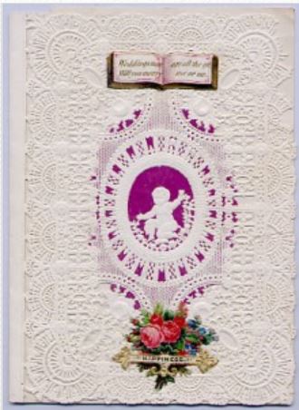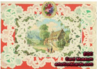 Made of glued bits of lace, ribbon, and cutouts of printed pictures, the cards were still essentially handmade. She introduced a number of innovations that remain popular to this day including pop ups, shadow boxes, and contrasting colors behind the lace, and one that is only now again available