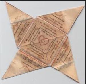 Soldiers also made folded cards like a Puzzle Purse by folding in the corners to make a paper pouch in which they would insert a trinket or lock of hair for their loved ones.