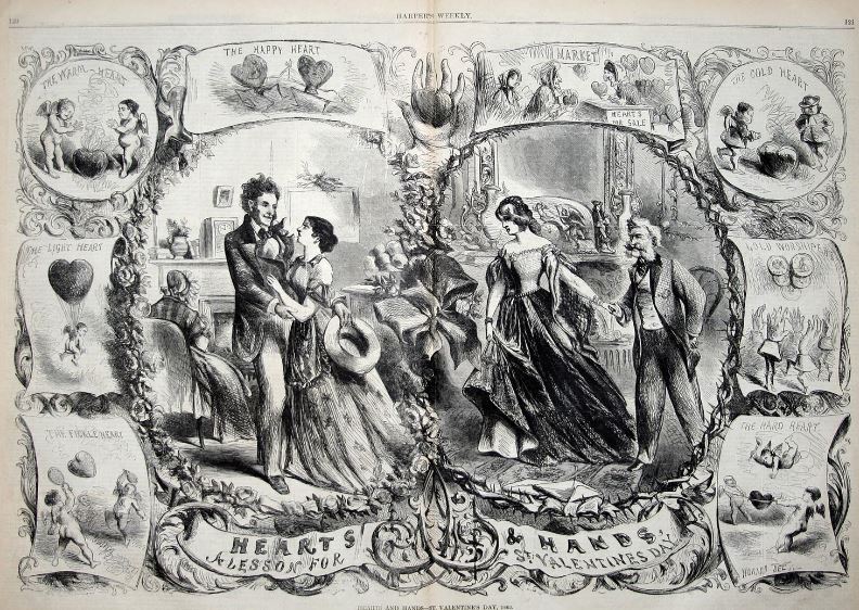 Valentine’s Day was a well-established holiday by the 1860’s, dating back to, it is attributed, the ancient Roman fertility festival of Lupercalia, and to St. Valentine who, it is said, sent the first valentine to the girl who had visited him in prison, signed “From Your Valentine.” However, it is clear that by the 1860s the religious aspect of the day had been put aside. George Tillotson (1863) writes in The Boy’s Yearly Book: “…St. Valentine’s Day now bears witness to the fact that a partial return to the pagan form has since been found agreeable. St. Valentine, personally, had nothing to do with the celebration of this day.”